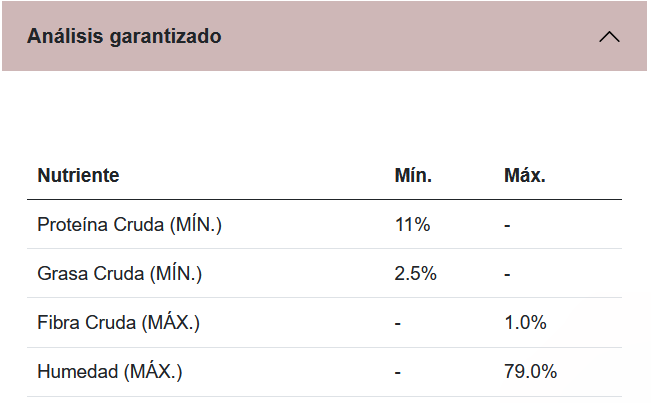 Agua suficiente para proceso, carne de pollo, hígado de cerdo, gluten de trigo, vísceras de cerdo, carne de pavo, harina de soya, almidón de maíz modificado, saborizante cárnico artificial y natural, fosfato tricálcico, minerales [cloruro de potasio, sulfato de zinc, sulfato ferroso, sulfato de manganeso, sulfato de cobre, yoduro de potasio], taurina, colorante (caramelo), sal, cloruro de colina, vitaminas [mononitrato de tiamina (vitamina B-1), suplemento de vitamina E, niacina (vitamina B-3), pantotenato de calcio (vitamina B-5), suplemento de vitamina A, complejo sódico de bisulfito de menadiona (vitamina K), hidrocloruro de piridoxina (vitamina B-6), suplemento de riboflavina (vitamina B-2), suplemento de vitamina B-12, biotina (vitamina B-7), ácido fólico (vitamina B-9), suplemento de vitamina D-3].