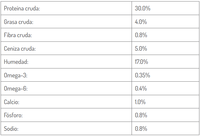 Ingredientes analíticos: proteína cruda 30.0%, grasa cruda 4.5%, humedad 17.0%, ceniza cruda 5.0%, fibras crudas 0.8%, calcio 1.0%, fósforo 0.8%, sodio 0.8%, omega 3 0.35%, omega 6 0.4%